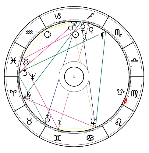 Kurz eine technische Randbemerkung für die Fachleute unter meinen Leserinnen und Lesern. Sie werden vielleicht einwenden, dass Venus und Sonne im Schützen stehen, aber der Mars schon im Steinbock und dass deshalb diese Verbindung zwischen Venus, Sonne und Mars nicht so stark ist, wie wenn Venus, Sonne und Mars in ein und demselben Zeichen stehen würden. Das ist natürlich richtig. Aber der Mars spiegelt über 0° Steinbock auf die Sonne und die Sonne steht in der Halbsumme von Venus und Mars, wodurch die Verbindung von Mars, Sonne und Venus zweifach gestärkt wird. Und es gibt noch eine dritte Konstellation, die ich besonders hervorheben möchte, nämlich den neuen Mondknoten in den Fischen: